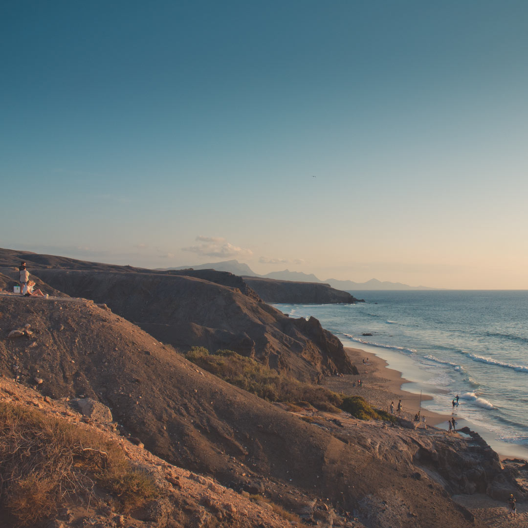 Aber in La Pared kann man noch mehr erleben: Einen ständig unverstellten Blick auf den Horizont, die Weite der wild romantischen Wüstenlandschaft mit ihren unendlich vielen gelben, ocker und rötlich-braunen Tönen, das tiefe Türkisblau des Atlantiks, das oft nahtlos in den Himmel übergeht. Wenn die Sonne am Abend im Meer untergeht, färbt sich der Himmel mitunter leuchtend violett.